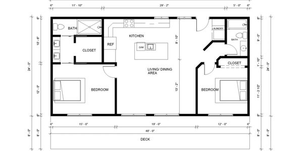The Dwell Ultra II is a stunning modern home featuring 2 bedrooms and 2 baths. Its inviting open central living space boasts ceilings up to 10 feet high. The spacious primary bedroom includes a zero-entry ensuite shower, space-saving soft open and close pocket doors, a walk-in closet, and a double vanity. The secondary bedroom is also spacious, with a large sliding glass door accessing the deck. The guest bathroom features a large tub-shower combination.