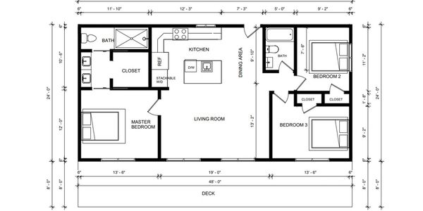 The Dwell Ultra III is a stunning modern home featuring 3 bedrooms and 2 baths. Its inviting open central living space boasts ceilings up to 10 feet high. The spacious primary bedroom includes a zero-entry ensuite shower, space-saving soft open and close pocket doors, a walk-in closet, and a double vanity. The two secondary bedrooms are generously sized, with one offering deck access. The guest bathroom features a large tub-shower combination.